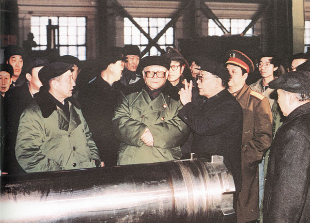 1990年2月17日中共中央總書記江澤民視察127廠時(shí)在車間聽(tīng)取匯報(bào)