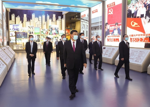 新近落成的中國(guó)共產(chǎn)黨歷史展覽館巍然矗立,氣勢(shì)恢宏。下午3時(shí)20分許,習(xí)近平等黨和國(guó)家領(lǐng)導(dǎo)同志來(lái)到這里,步入展廳參觀展覽。展覽以“不忘初心、牢記使命”為主題,精心設(shè)計(jì)了“建立中國(guó)共產(chǎn)黨 奪取新民主主義革命偉大勝利”、“成立中華人民共和國(guó) 進(jìn)行社會(huì)主義革命和建設(shè)”、“實(shí)行改革開放 開創(chuàng)和發(fā)展中國(guó)特色社會(huì)主義”、“推進(jìn)中國(guó)特色社會(huì)主義進(jìn)入新時(shí)代 全面建成小康社會(huì) 開啟全面建設(shè)社會(huì)主義現(xiàn)代化國(guó)家新(人民日?qǐng)?bào))征程”4個(gè)部分,通過(guò)2600余幅圖片、3500多件套文物實(shí)物,第一次全方位、全過(guò)程、全景式、史詩(shī)般展現(xiàn)中國(guó)共產(chǎn)黨波瀾壯闊的百年歷程,濃墨重彩地反映黨的不懈奮斗史、不怕犧牲史、理論探索史、為民造福史、自身建設(shè)史,使人們深刻認(rèn)識(shí)到紅色政權(quán)來(lái)之不易、新中國(guó)來(lái)之不易、中國(guó)特色社會(huì)主義來(lái)之不易,深刻認(rèn)識(shí)到中國(guó)共產(chǎn)黨為什么能、馬克思主義為什么行、中國(guó)特色社會(huì)主義為什么好。