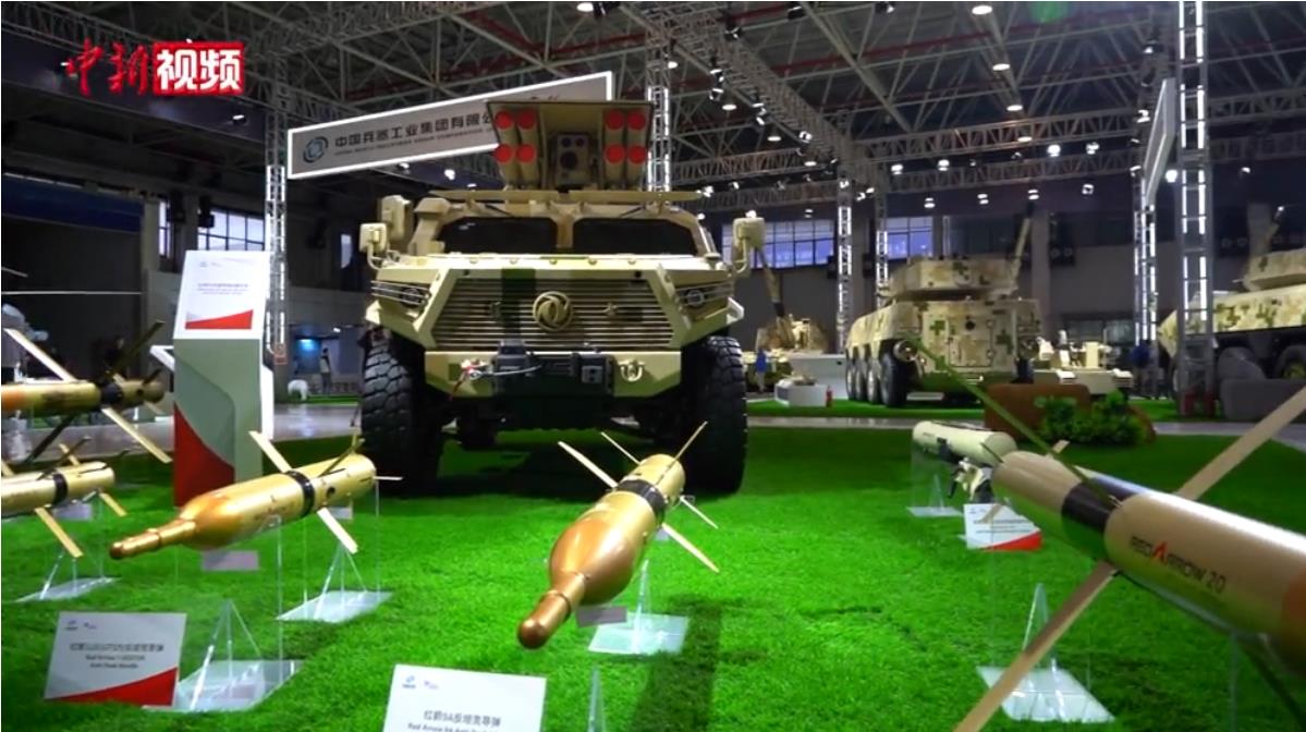 【解說】據(jù)介紹,中國兵器工業(yè)集團帶來的展品共計175款,其中52款為首次參展。在展館最顯眼處是一輛全新發(fā)布的升級款的VT4系列主戰(zhàn)坦克,它在態(tài)勢感知能力,有/無人協(xié)同作戰(zhàn)能力上有全面提升。