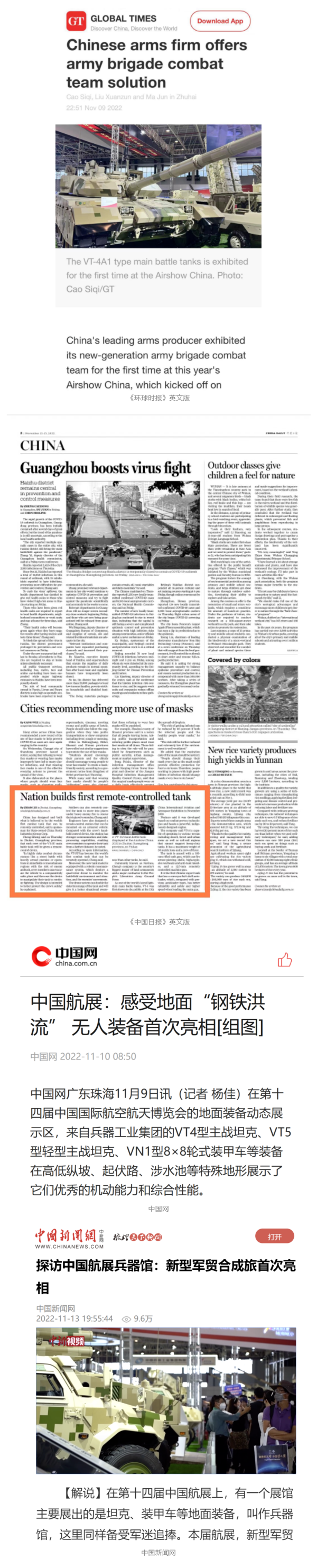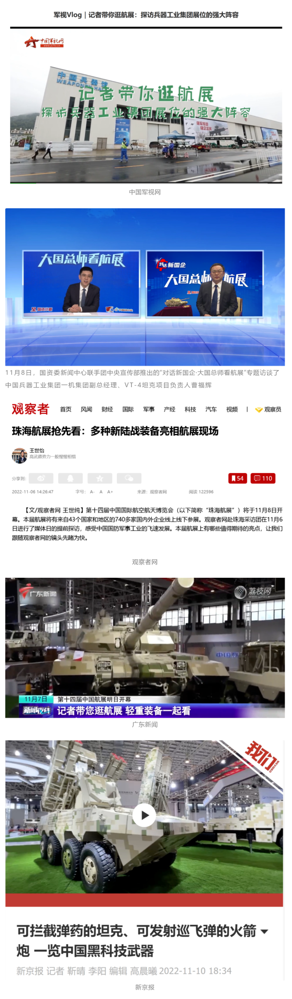 央視國防軍事頻道航展特別報道《炫舞天地間》11月12日《賞“鐵甲雄風”!看航展地面裝備“鋼鐵洪流”名場面》對兵器工業(yè)集團武器裝備特色亮點進行報道?!秶儡娛略鐖蟆?1月7日推出報道《第十四屆中國國際航空航天博覽會明天開幕 中國兵器館首次以陸軍合成旅實戰(zhàn)體系形式展出》,對兵器館陸軍合成旅實戰(zhàn)體系進行報道。《軍事報道》11月9日推出《第十四屆中國國際航空航天博覽會 地面兵器裝備首次聯(lián)合陸航直升機進行動態(tài)展示》報道?!盾娒孕刑煜隆?1月9日推出報道《軍迷打卡航展2022》以專業(yè)軍迷視角探館兵器館,全面展示兵器工業(yè)集團參展裝備特色亮點。