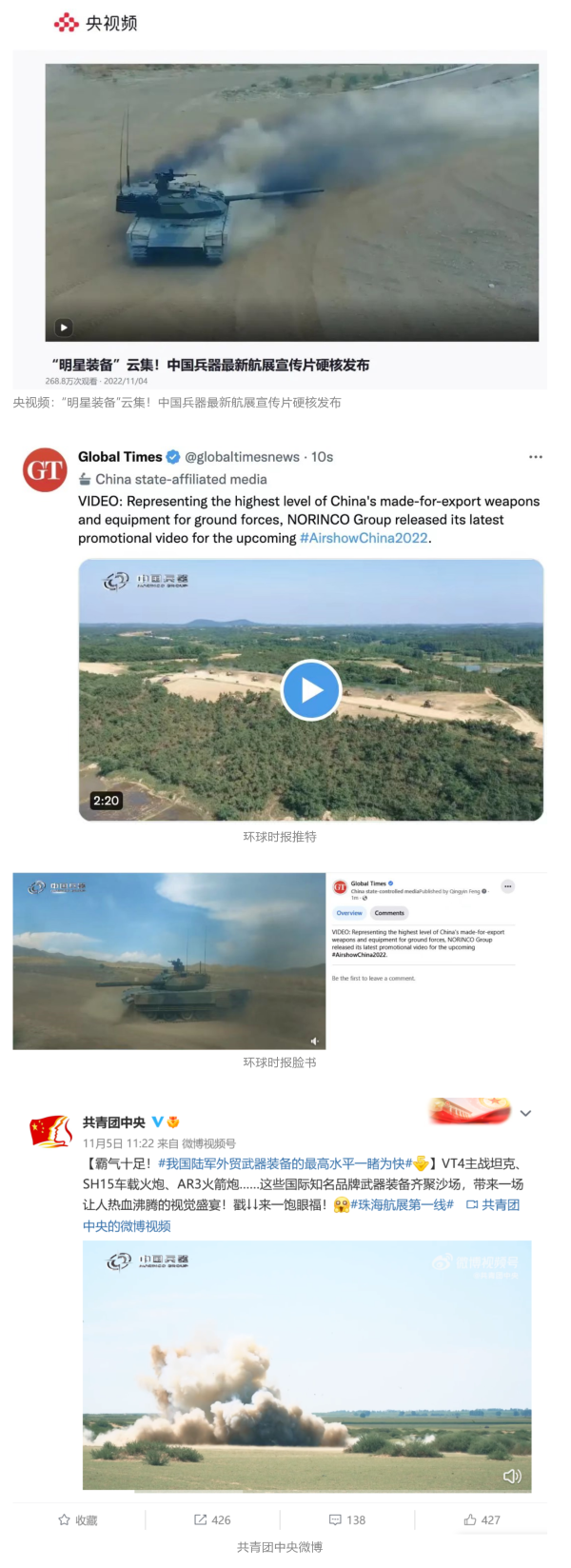 人民日報官方微博、微信公眾號,新華社客戶端、央視新聞客戶端、中國日報微博、參考消息微信公眾號、解放軍報微博、央視軍事微博、CGTN微博、中國軍號微博、共青團中央微博、環(huán)球時報(英文網(wǎng)站、臉書賬號、推特賬號)、嗶哩嗶哩、學習強國平臺、國資小新視頻號、網(wǎng)易軍事、騰訊軍事、鳳凰軍事、北京日報、東方衛(wèi)視看看新聞全媒體、北京電視臺等20余家中央主流媒體、國家部委、省市媒體的新媒體第一時間播發(fā)集團公司航展宣傳片等視頻作品燃爆全網(wǎng),累計閱讀量突破1700萬人次。集團公司微信公眾號、微博、抖音號、快手號、微信視頻號、知乎號等新媒體宣傳片播放閱讀量超過800萬人次,點贊超過30萬人次。集團公司微信公眾號推出《硬核!中國兵器最新航展宣傳片發(fā)布》《中國兵器航展節(jié)目單,請選出心中明星裝備》《航展首日,中國兵器閃耀亮相!》等7篇報道,閱讀量超過25萬人次,集團公司微信視頻號、抖音號、快手號等新媒體賬號發(fā)布“中國兵器航展大秀”系列視頻,觀看量超過330萬人次。