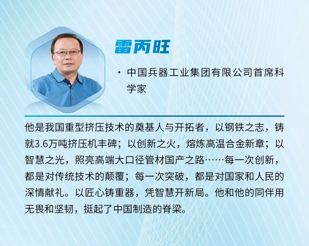 近日,《科學(xué)中國(guó)人》雜志社發(fā)布2024“年度科技人物”榜單,中國(guó)兵器首席科學(xué)家、北重集團(tuán)雷丙旺當(dāng)選“影響力科學(xué)家”。 雷丙旺是我國(guó)極端金屬擠壓技術(shù)的開(kāi)拓者,扎根邊疆地區(qū)國(guó)防特大型企業(yè)工作38年,長(zhǎng)期從事金屬成形制造裝備與工藝研究工作。他研制出我國(guó)極限制造的大國(guó)重器——3.6萬(wàn)噸黑色金屬垂直擠壓機(jī),一舉打破國(guó)外技術(shù)封鎖,填補(bǔ)國(guó)內(nèi)空白,實(shí)現(xiàn)了超(超)臨界電站核心管道和航空發(fā)動(dòng)機(jī)高壓渦輪盤粉末合金棒材的中國(guó)制造,開(kāi)發(fā)出成套關(guān)鍵技術(shù),取得一系列原創(chuàng)性成果,促進(jìn)了產(chǎn)業(yè)的融合發(fā)展,創(chuàng)造巨大經(jīng)濟(jì)社會(huì)效益。