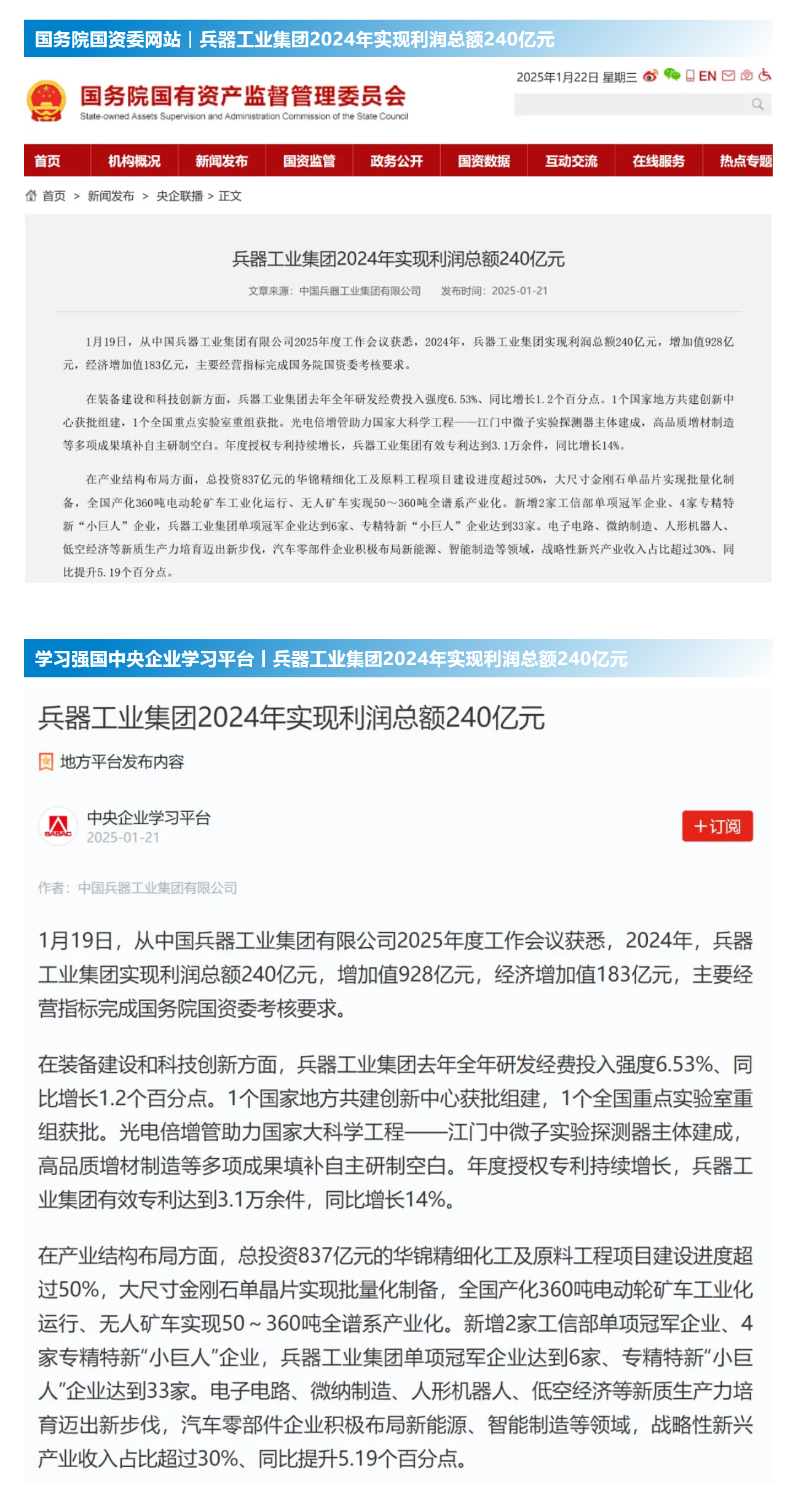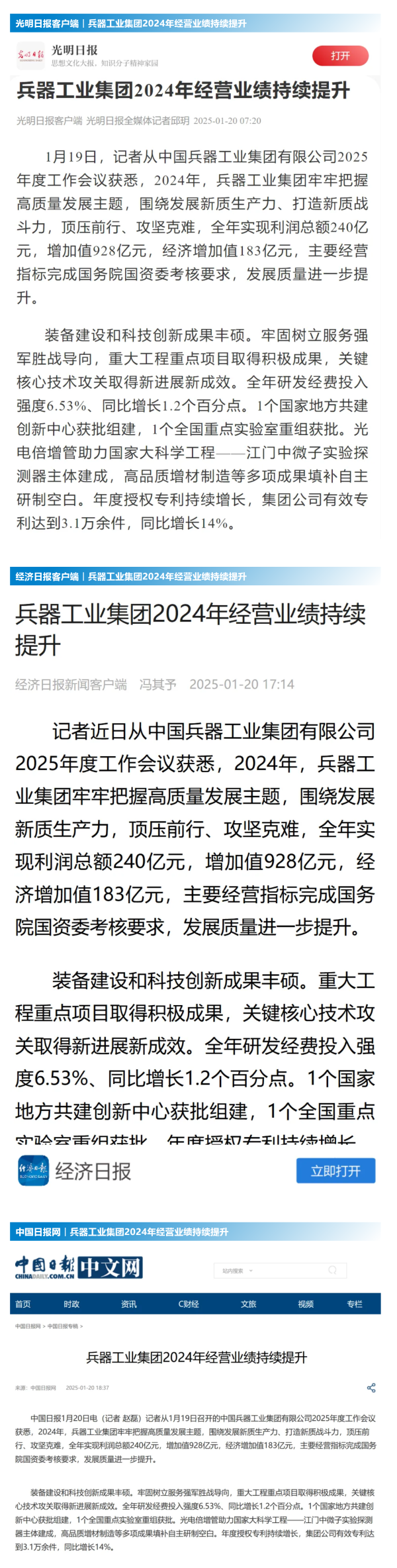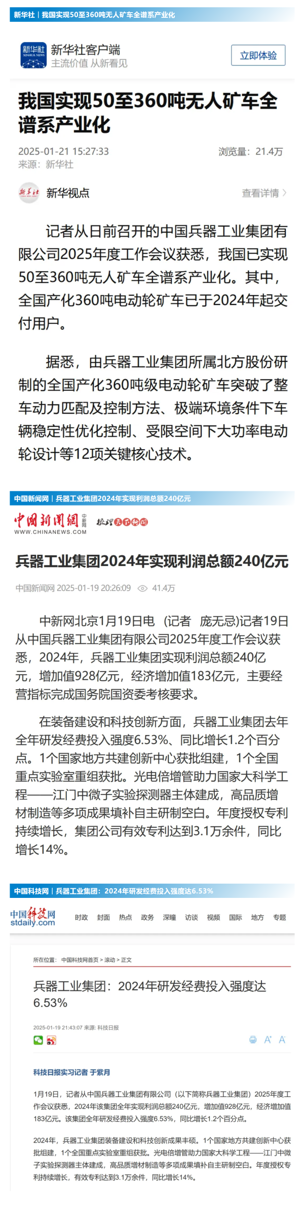 1月19日至20日,中國兵器工業(yè)集團(tuán)有限公司2025年度工作會議在京召開,會議總結(jié)2024年工作,分析形勢任務(wù),明確工作思路,部署2025年工作。 集團(tuán)公司2024年取得的成績及下一步重點(diǎn)工作受到社會媒體廣泛關(guān)注。新華社、中國新聞網(wǎng)、中國科技網(wǎng)、光明日報客戶端、經(jīng)濟(jì)日報客戶端、中國日報網(wǎng)、國務(wù)院國資委網(wǎng)站、學(xué)習(xí)強(qiáng)國中央企業(yè)學(xué)習(xí)平臺、新浪網(wǎng)、網(wǎng)易網(wǎng)、搜狐網(wǎng)、騰訊網(wǎng)、鳳凰網(wǎng)等中央主流媒體、國家部委網(wǎng)站及知名網(wǎng)絡(luò)媒體對集團(tuán)公司2025年度工作會議進(jìn)行了報道,重點(diǎn)關(guān)注集團(tuán)公司經(jīng)營業(yè)績、科技創(chuàng)新、產(chǎn)業(yè)結(jié)構(gòu)布局優(yōu)化等情況。其中,新華社以《我國實(shí)現(xiàn)50至360噸無人礦車全譜系產(chǎn)業(yè)化》為題,重點(diǎn)報道了集團(tuán)公司在推動智能制造水平提升方面取得的成效;中國新聞網(wǎng)、光明日報客戶端、經(jīng)濟(jì)日報客戶端、中國日報網(wǎng)等就集團(tuán)公司2024年度經(jīng)營業(yè)績及各項(xiàng)工作取得的成果進(jìn)行報道;中國科技網(wǎng)著重報道了集團(tuán)公司在科技創(chuàng)新和優(yōu)化產(chǎn)業(yè)結(jié)構(gòu)布局方面的最新進(jìn)展。集團(tuán)公司門戶網(wǎng)站、微信公眾號、微博等新媒體平臺以及《中國兵工報》也對集團(tuán)公司工作會議進(jìn)行了及時報道,各成員單位紛紛對相關(guān)內(nèi)容進(jìn)行轉(zhuǎn)載,引發(fā)全系統(tǒng)關(guān)注。